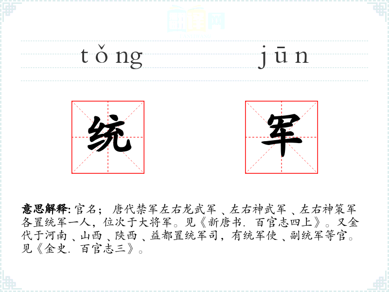 官名; 唐代禁军左右龙武军﹑左右神武军﹑左右神策军各置统军一人,位次于大将军。见《新唐书.百官志四上》。又金代于河南﹑山西﹑陕西﹑益都置统军司,有统军使﹑副统军等官。见《金史.百官志三》。