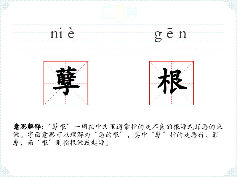 “孽根”一词在中文里通常指的是不良的根源或罪恶的来源。字面意思可以理解为“恶的根”,其中“孽”指的是恶行、罪孽,而“根”则指根源或起源。
