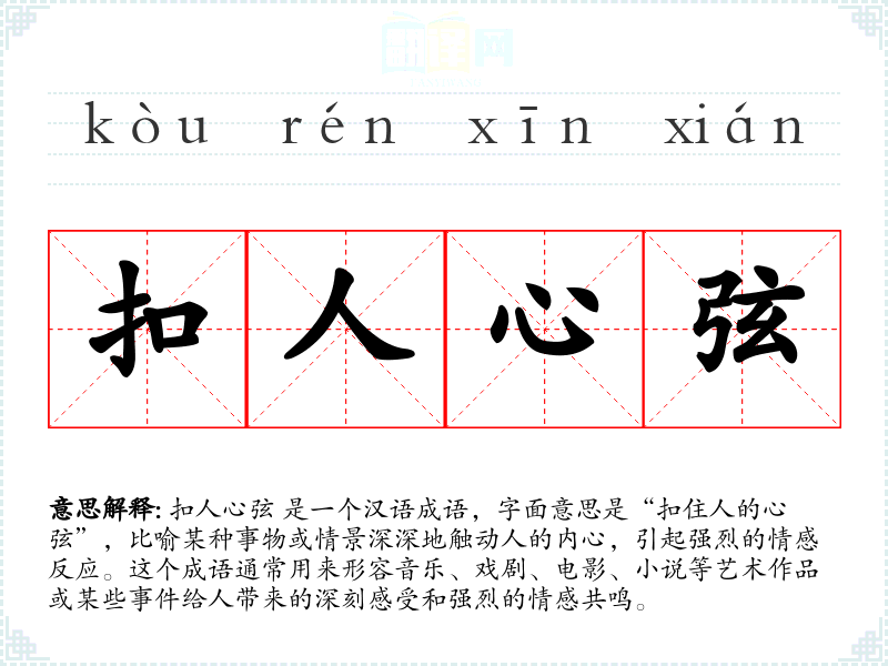 扣人心弦 是一个汉语成语,字面意思是“扣住人的心弦”,比喻某种事物或情景深深地触动人的内心,引起强烈的情感反应。这个成语通常用来形容音乐、戏剧、电影、小说等艺术作品或某些**给人带来的深刻感受和强烈的情感共鸣。