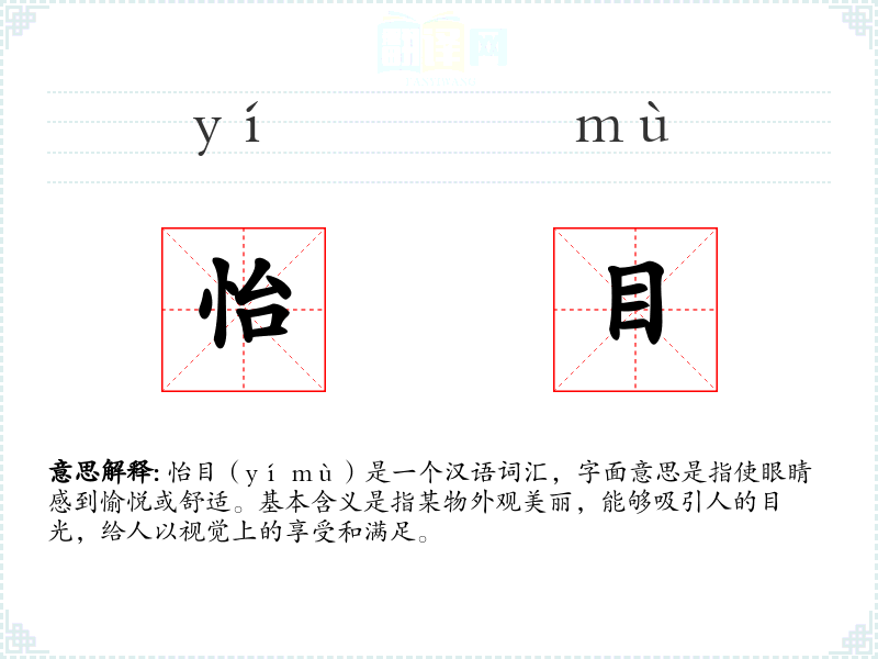怡目(yí mù)是一个汉语词汇,字面意思是指使眼睛感到愉悦或舒适。基本含义是指某物外观美丽,能够吸引人的目光,给人以视觉上的享受和满足。
