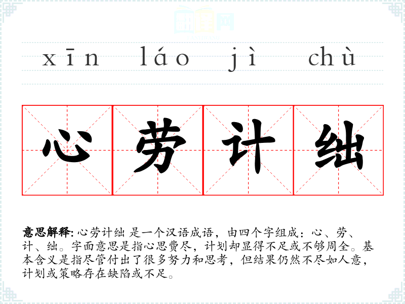 心劳计绌 是一个汉语成语,由四个字组成:心、劳、计、绌。字面意思是指心思费尽,计划却显得不足或不够周全。基本含义是指尽管付出了很多努力和思考,但结果仍然不尽如人意,计划或策略存在缺陷或不足。
