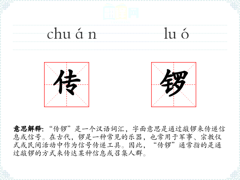 在传统文化中,锣常用于仪式、节日庆典和军事活动中。因此,“传锣”不仅是一种信号传递方式,也承载了一定的文化和社会意义,反映了古代社会的组织形式和通讯手段。
