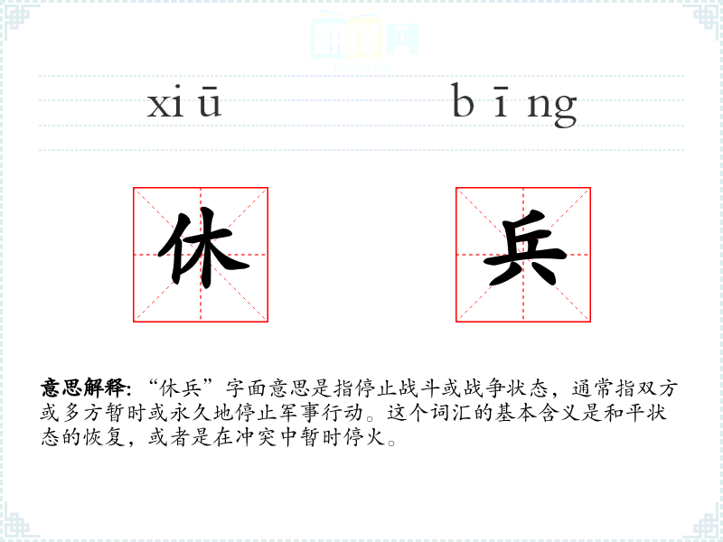 “休兵”字面意思是指停止战斗或战争状态,通常指双方或多方暂时或永久地停止军事行动。这个词汇的基本含义是和平状态的恢复,或者是在冲突中暂时停火。