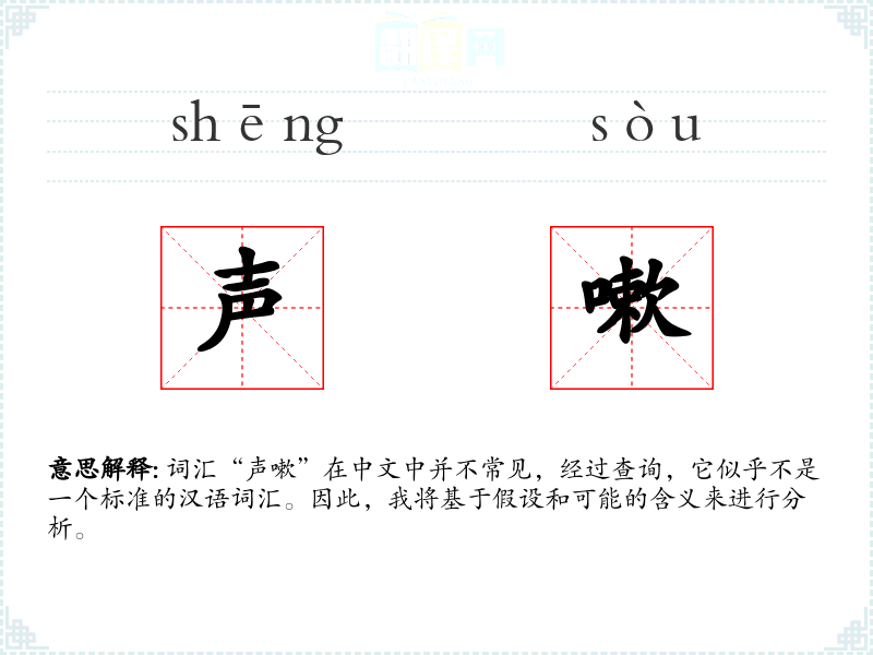 词汇“声嗽”在中文中并不常见,经过查询,它似乎不是一个标准的汉语词汇。因此,我将基于假设和可能的含义来进行分析。