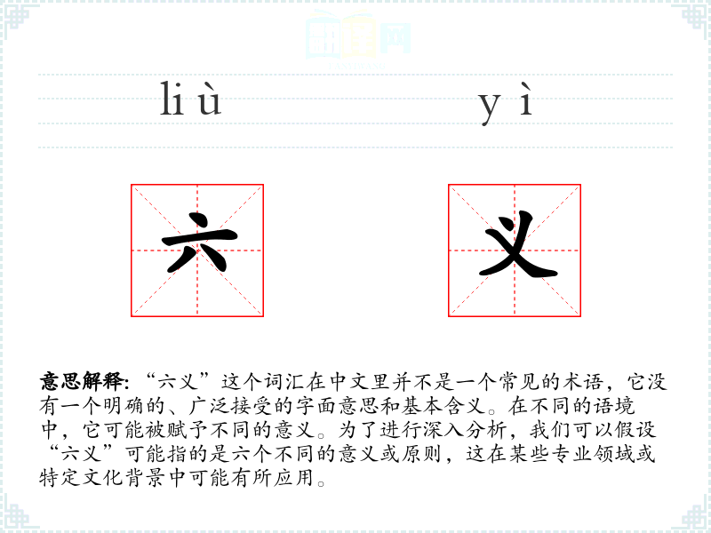 “六义”这个词汇在中文里并不是一个常见的术语,它没有一个明确的、广泛接受的字面意思和基本含义。在不同的语境中,它可能被赋予不同的意义。为了进行深入分析,我们可以假设“六义”可能指的是六个不同的意义或原则,这在某些专业领域或特定文化背景中可能有所应用。
