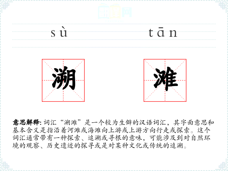 词源与演变: “溯”字在汉语中意为逆流而上,而“滩”指河滩或海滩。这个词汇的组合反映了其字面意义,即沿着河滩逆流而上。在语言的历史演变中,这个词汇可能随着人们对自然环境的探索和认识而逐渐形成并被使用。