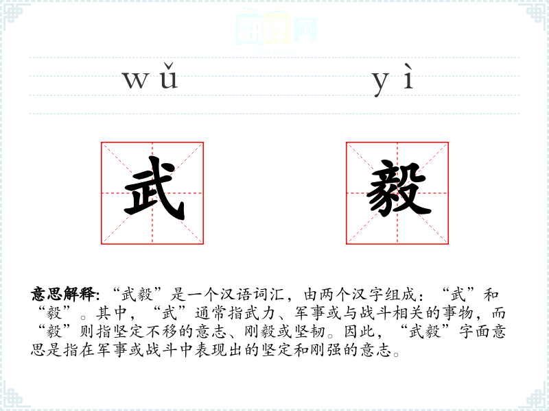 “武毅”是一个汉语词汇,由两个汉字组成:“武”和“毅”。其中,“武”通常指武力、军事或与战斗相关的事物,而“毅”则指坚定不移的意志、刚毅或坚韧。因此,“武毅”字面意思是指在军事或战斗中表现出的坚定和刚强的意志。