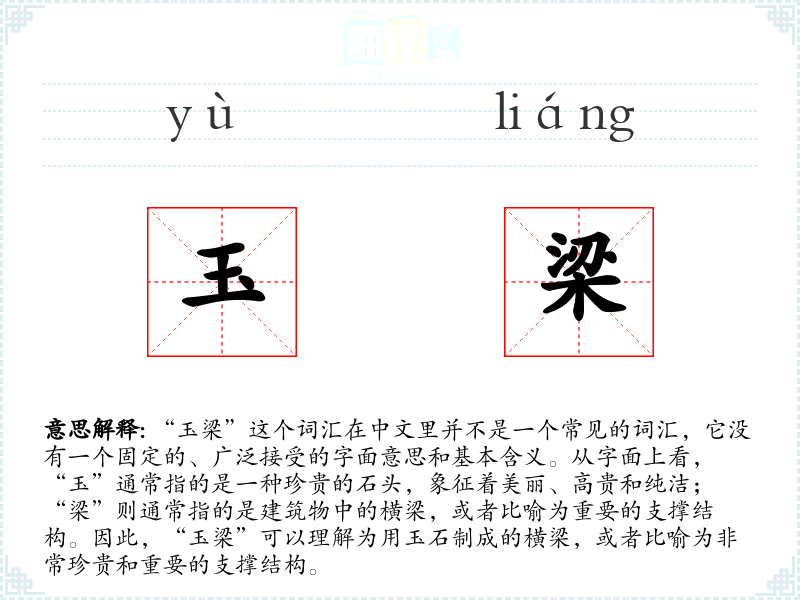 由于“玉梁”是一个非常特定的中文词汇,它在其他语言或文化中并没有直接对应的词汇。