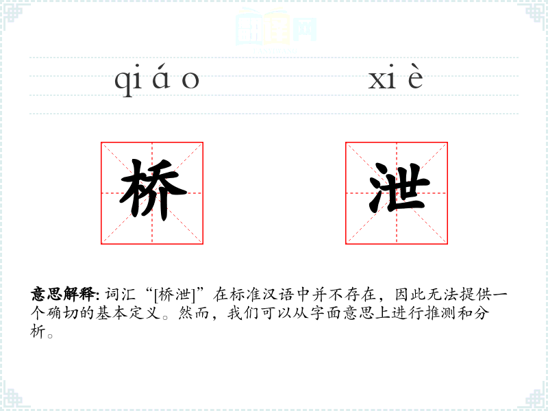 词汇“[桥泄]”在标准汉语中并不存在,因此无法提供一个确切的基本定义。然而,我们可以从字面意思上进行推测和分析。