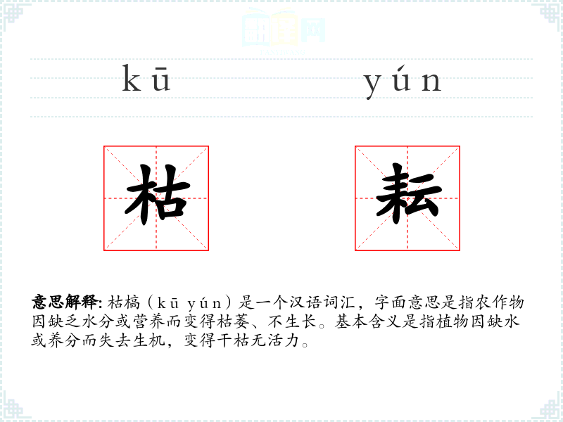 枯槁(kū yún)是一个汉语词汇,字面意思是指农作物因缺乏水分或营养而变得枯萎、不生长。基本含义是指植物因缺水或养分而失去生机,变得干枯无活力。