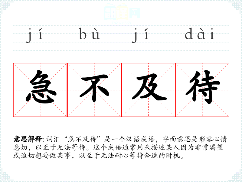 词汇“急不及待”是一个汉语成语,字面意思是形容心情急切,以至于无法等待。这个成语通常用来描述某人因为非常渴望或迫切想要做某事,以至于无法耐心等待合适的时机。