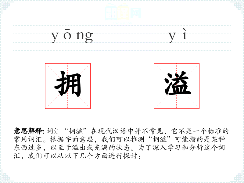 总的来说,“拥溢”这个词汇虽然不常见,但它可以用来形容一种极端的、充满的状态。在语言学*和表达中,了解和掌握这样的词汇可以帮助我们更准确地表达复杂的情感和场景。