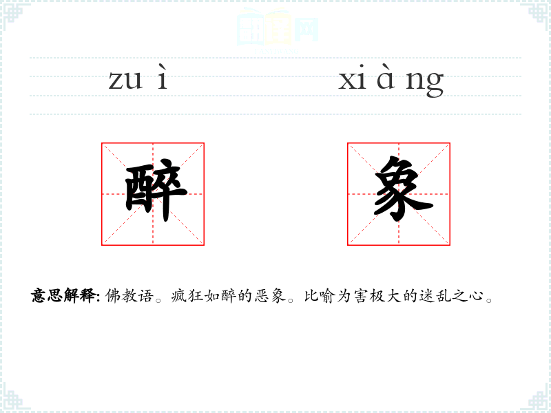 佛教语。疯狂如醉的恶象。比喻为害极大的迷乱之心。