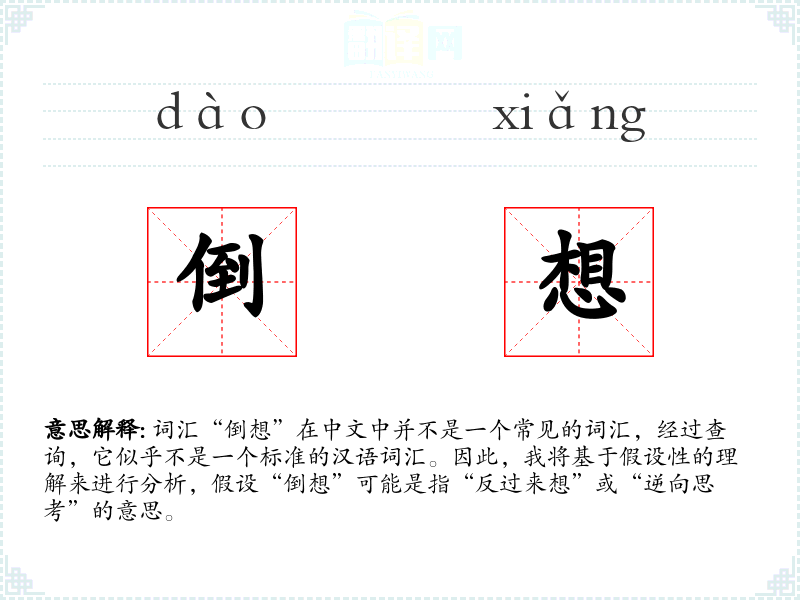 词汇“倒想”在中文中并不是一个常见的词汇,经过查询,它似乎不是一个标准的汉语词汇。因此,我将基于假设性的理解来进行分析,假设“倒想”可能是指“反过来想”或“逆向思考”的意思。