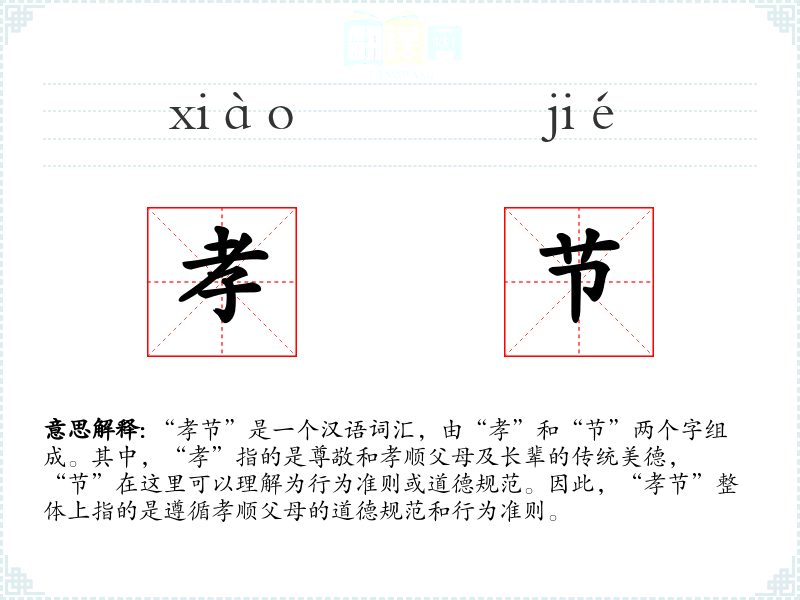 “孝节”是一个汉语词汇,由“孝”和“节”两个字组成。其中,“孝”指的是尊敬和孝顺父母及长辈的传统美德,“节”在这里可以理解为行为准则或道德规范。因此,“孝节”整体上指的是遵循孝顺父母的道德规范和行为准则。