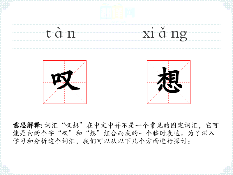 词汇“叹想”在中文中并不是一个常见的固定词汇,它可能是由两个字“叹”和“想”组合而成的一个临时表达。为了深入学习和分析这个词汇,我们可以从以下几个方面进行探讨: