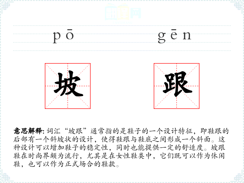 词汇“坡跟”通常指的是鞋子的一个设计特征,即鞋跟的后部有一个斜坡状的设计,使得鞋跟与鞋底之间形成一个斜面。这种设计可以增加鞋子的稳定性,同时也能提供一定的舒适度。坡跟鞋在时尚界颇为流行,尤其是在女性鞋类中,它们既可以作为休闲鞋,也可以作为正式场合的鞋款。