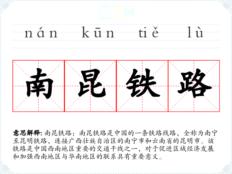 南昆铁路作为一个专业术语,不仅代表了具体的交通线路,也象征着区域发展和文化交流。在语言学*和表达中,了解和运用这样的词汇有助于更深入地理解地理、交通和文化等方面的知识。