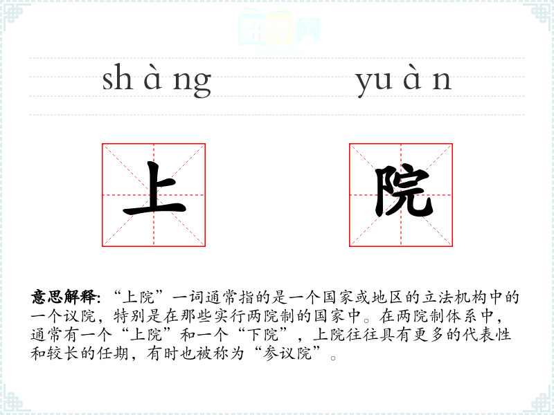 “上院”一词通常指的是一个国家或地区的立法机构中的一个议院,特别是在那些实行两院制的国家中。在两院制体系中,通常有一个“上院”和一个“下院”,上院往往具有更多的代表性和较长的任期,有时也被称为“参议院”。