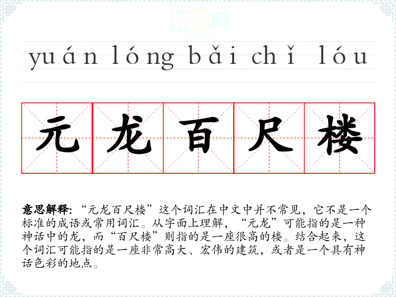 “元龙百尺楼”这个词汇在中文中并不常见,它不是一个标准的成语或常用词汇。从字面上理解,“元龙”可能指的是一种神话中的龙,而“百尺楼”则指的是一座很高的楼。结合起来,这个词汇可能指的是一座非常高大、宏伟的建筑,或者是一个具有神话色彩的地点。