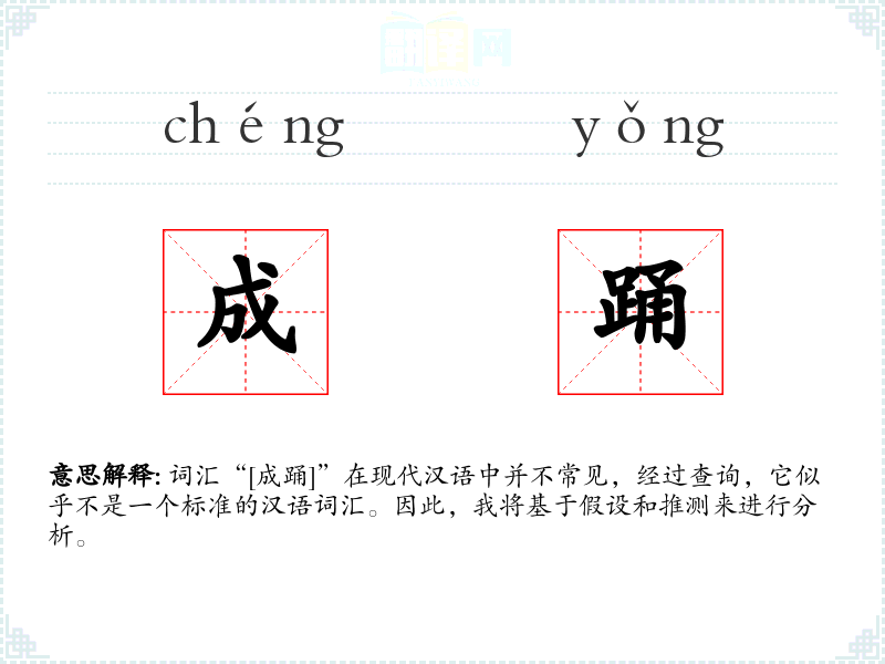 词汇“[成踊]”在现代汉语中并不常见,经过查询,它似乎不是一个标准的汉语词汇。因此,我将基于假设和推测来进行分析。