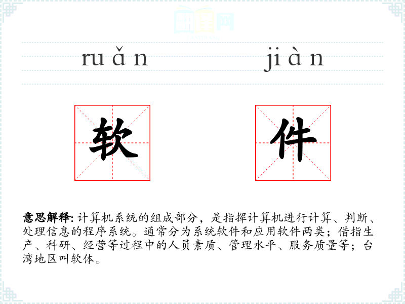 计算机系统的组成部分,是指挥计算机进行计算、判断、处理信息的程序系统。通常分为系统软件和应用软件两类;借指生产、科研、经营等过程中的人员素质、管理水平、服务质量等;台湾地区叫软体。