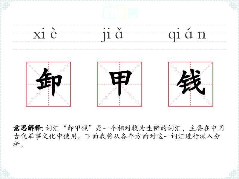 词汇“卸甲钱”是一个相对较为生僻的词汇,主要在中国古代军事文化中使用。下面我将从各个方面对这一词汇进行深入分析。