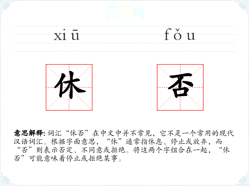 - 理解:“休否”是一个带有古代色彩的词汇,现代汉语中使用较少,但在某些正式或古代文献的语境中仍然有其特定的意义和用法。