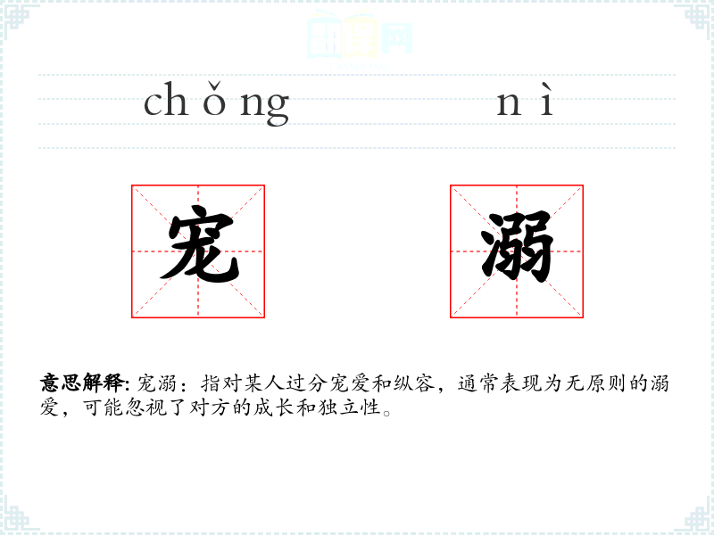 宠溺:指对某人过分宠爱和纵容,通常表现为无原则的溺爱,可能忽视了对方的成长和独立性。