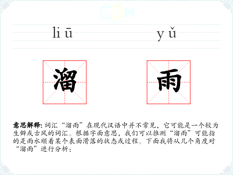- 反义词:无(由于“溜雨”较为生僻,反义词不明显)