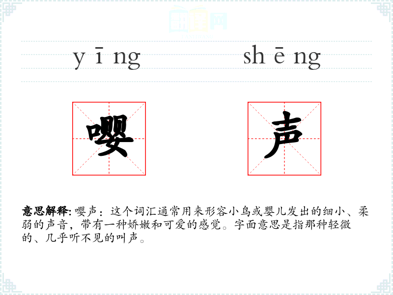 嘤声:这个词汇通常用来形容**或婴儿发出的细小、柔弱的声音,带有一种娇嫩和可爱的感觉。字面意思是指那种轻微的、几乎听不见的叫声。
