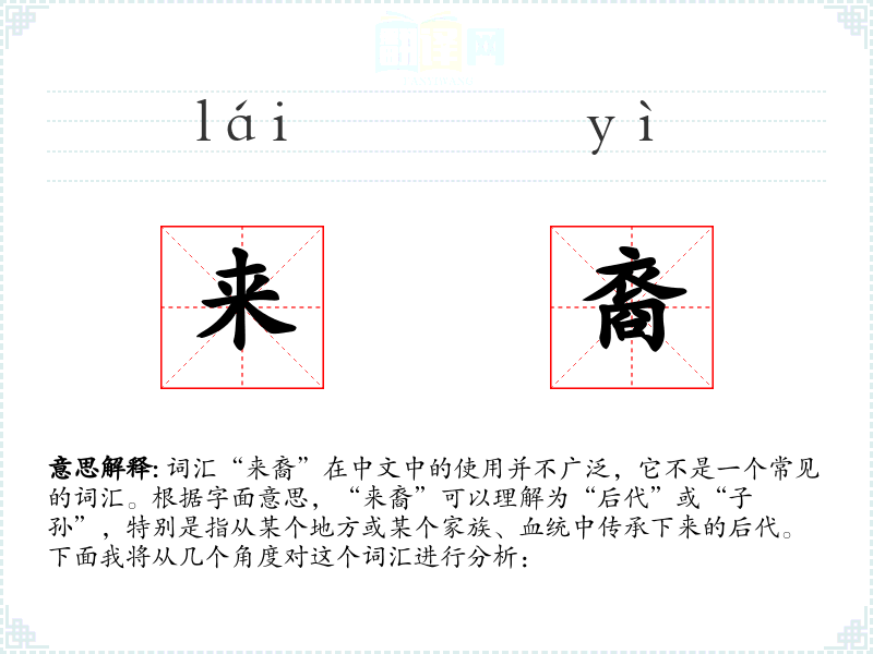 “来裔”由两个字组成:“来”和“裔”。“来”通常表示到来或来自某个地方,而“裔”则指后代或子孙。结合起来,“来裔”可以理解为从某个地方或血统中传承下来的后代。