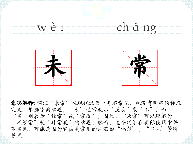 词汇“未常”在现代汉语中并不常见,也没有明确的标准定义。根据字面意思,“未”通常表示“没有”或“不”,而“常”则表示“经常”或“常规”。因此,“未常”可以理解为“不经常”或“非常规”的意思。然而,这个词汇在实际使用中并不常见,可能是因为它被更常用的词汇如“偶尔”、“罕见”等所替代。
