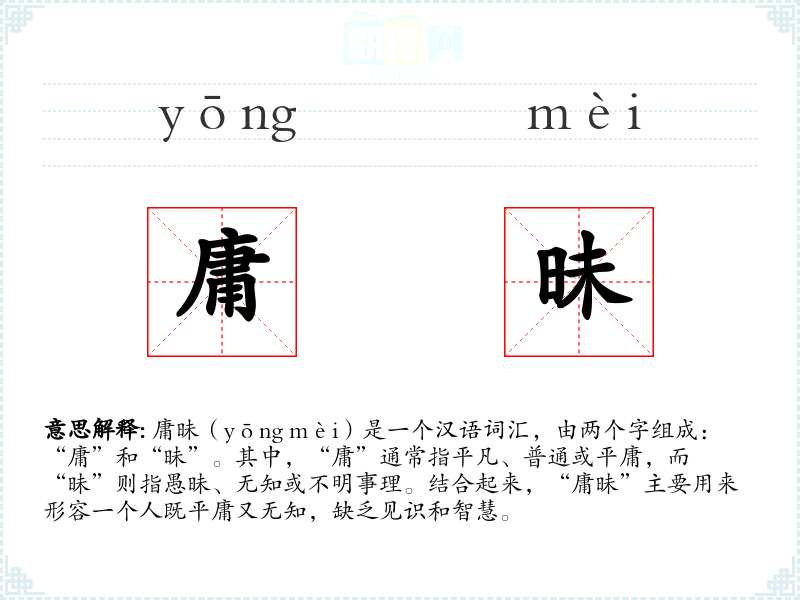 “庸”字最早见于《说文解字》,原意为“常”,后引申为平凡、普通。“昧”字则源自“晦”,意为不明、暗淡。两个字结合后,“庸昧”成为一个形容人智慧和见识不足的词汇。