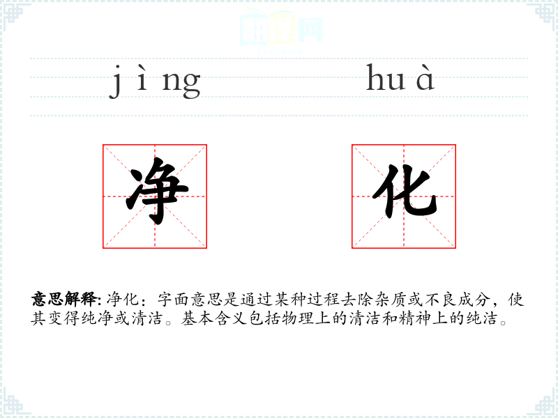 净化:字面意思是通过某种过程去除杂质或不良成分,使其变得纯净或清洁。基本含义包括物理上的清洁和精神上的纯洁。