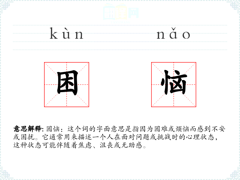 困恼:这个词的字面意思是指因为困难或烦恼而感到不安或困扰。它通常用来描述一个人在面对问题或挑战时的心理状态,这种状态可能伴随着焦虑、沮丧或无助感。