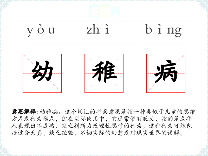幼稚病:这个词汇的字面意思是指一种类似于儿童的思维方式或行为模式,但在实际使用中,它通常带有贬义,指的是成年人表现出不成熟、缺乏判断力或理性思考的行为。这种行为可能包括过分天真、缺乏经验、不切实际的幻想或对现实世界的误解。