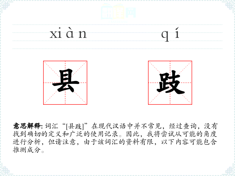 由于“[县跂]”不是一个标准的现代汉语词汇,我们无法提供确切的字面意思和基本含义。它可能是某个方言词汇、古文词汇或者是一个打字错误。