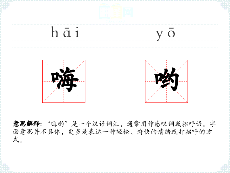 - 文学:在文学作品中,“嗨哟”可能用来描绘轻松愉快的场景或人物之间的亲切互动。