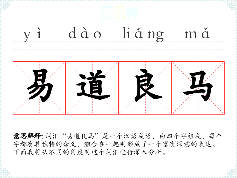 词汇“易道良马”是一个汉语成语,由四个字组成,每个字都有其独特的含义,组合在一起则形成了一个富有深意的表达。下面我将从不同的角度对这个词汇进行深入分析。