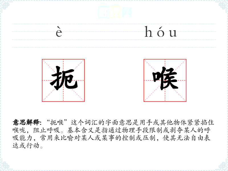 “扼喉”这个词带给人的情感反应通常是紧张和不安,因为它涉及对生命和自由的威胁。联想可能包括窒息、压迫和无力感。