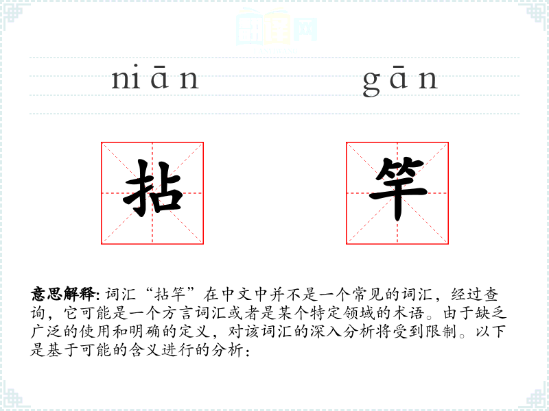 词汇“拈竿”在中文中并不是一个常见的词汇,经过查询,它可能是一个方言词汇或者是某个特定领域的术语。由于缺乏广泛的使用和明确的定义,对该词汇的深入分析将受到限制。以下是基于可能的含义进行的分析:
