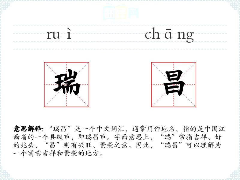 “瑞昌”是一个中文词汇,通常用作地名,指的是**江西省的一个县级市,即瑞昌市。字面意思上,“瑞”常指吉祥、好的兆头,“昌”则有兴旺、繁荣之意。因此,“瑞昌”可以理解为一个寓意吉祥和繁荣的地方。