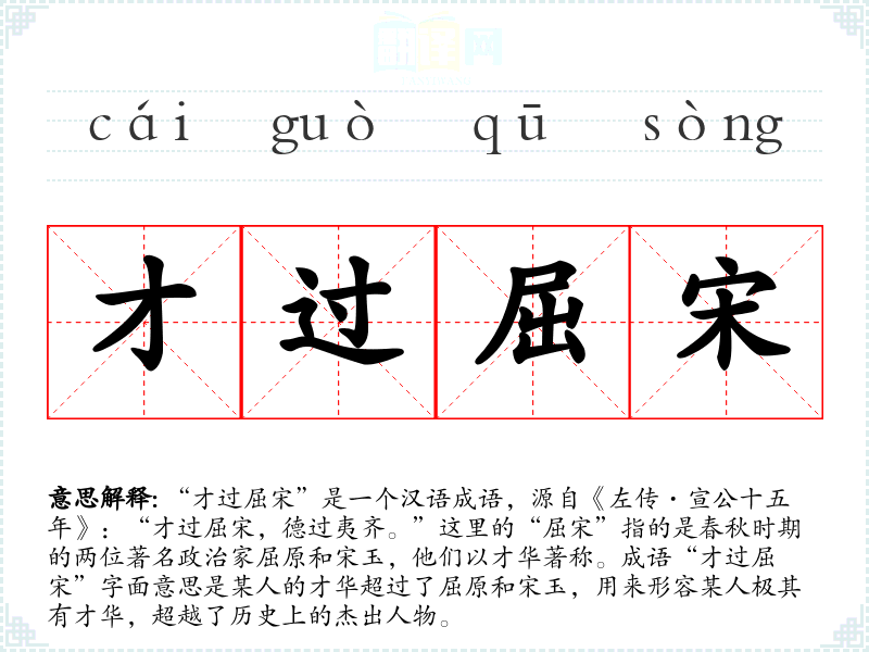 “才过屈宋”是一个汉语成语,源自《左传·宣公十五年》:“才过屈宋,德过夷齐。”这里的“屈宋”指的是春秋时期的两位著名政治家屈原和宋玉,他们以才华著称。成语“才过屈宋”字面意思是某人的才华超过了屈原和宋玉,用来形容某人极其有才华,超越了历史上的杰出人物。