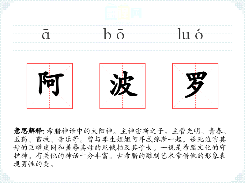1.希腊神话中的太阳神。主神宙斯之子。主管光明、青春、医药、畜牧、音乐等。曾与孪生姐姐阿耳忒弥斯一起,杀死迫害其母的巨蟒皮同和羞辱其母的尼俄柏及其子女。一说是希腊文化的守护神。有关他的神话十分丰富。古希腊的雕刻艺术常借他的形象表现男性的美。