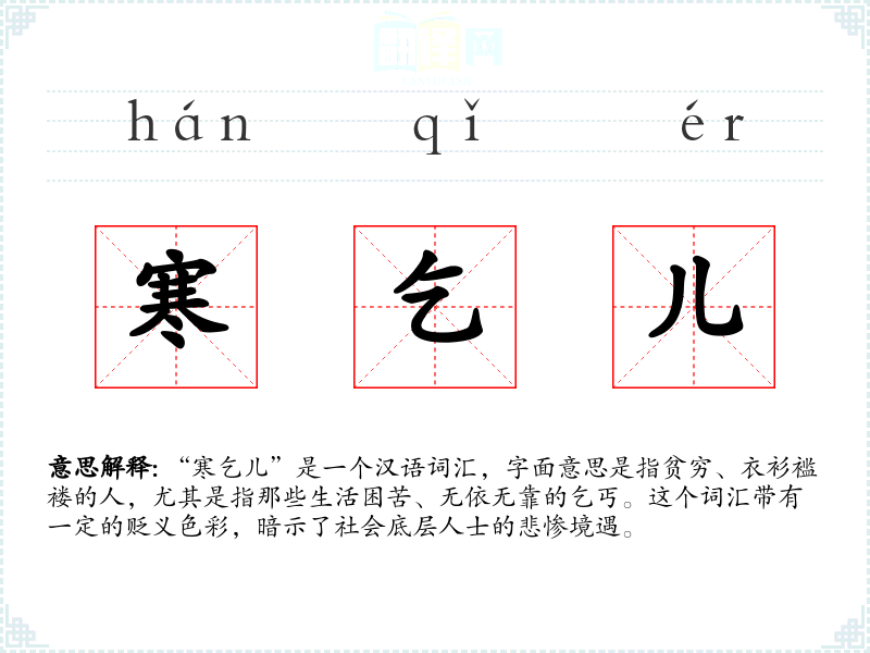 “寒乞儿”是一个汉语词汇,字面意思是指贫穷、衣衫褴褛的人,尤其是指那些生活困苦、无依无靠的乞丐。这个词汇带有一定的贬义色彩,暗示了社会底层人士的悲惨境遇。