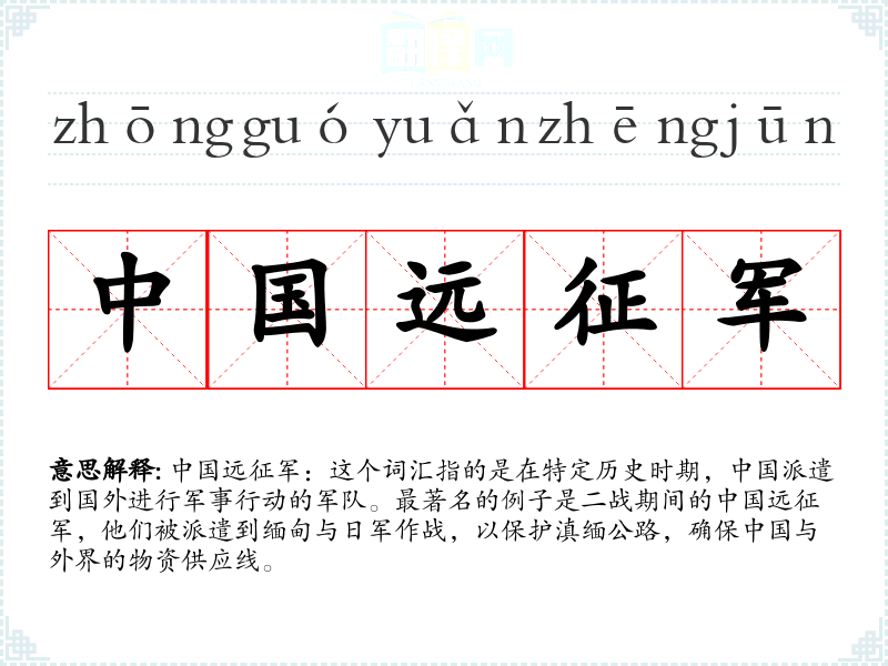 - 理解:**远征军是一个充满历史意义的词汇,它不仅代表了军事行动,也象征了民族的坚韧和国际合作的精神。
