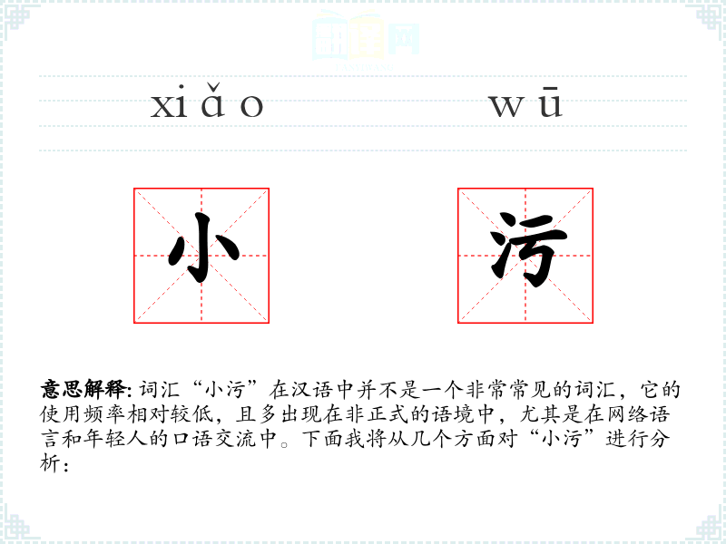 词汇“小污”在汉语中并不是一个非常常见的词汇,它的使用频率相对较低,且多出现在非正式的语境中,尤其是在网络语言和年轻人的口语交流中。下面我将从几个方面对“小污”进行分析: