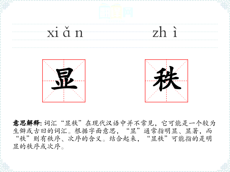 词汇“显秩”在现代汉语中并不常见,它可能是一个较为生僻或古旧的词汇。根据字面意思,“显”通常指明显、显著,而“秩”则有秩序、次序的含义。结合起来,“显秩”可能指的是明显的秩序或次序。