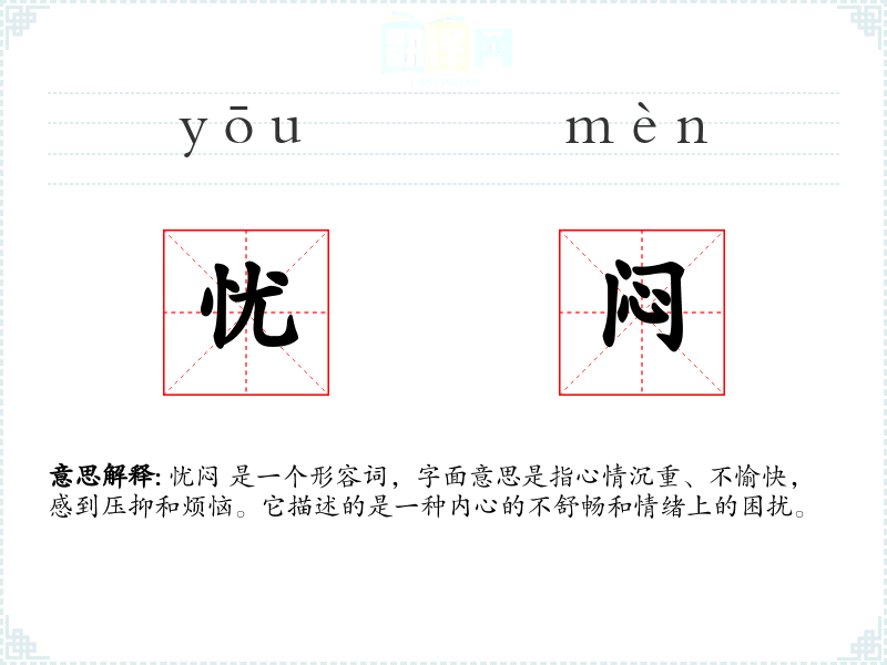 忧闷 是一个形容词,字面意思是指心情沉重、不愉快,感到压抑和烦恼。它描述的是一种内心的不舒畅和情绪上的困扰。